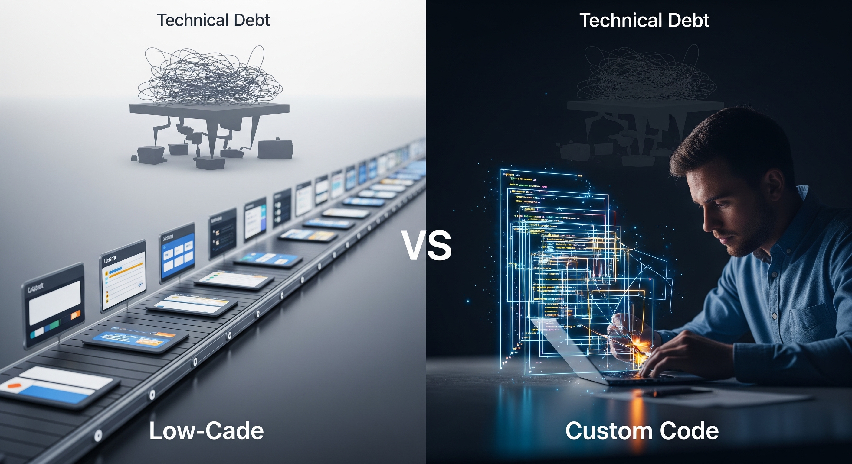Choosing between them means thinking about the trade-offs between getting something out quickly and the long-term effects on tech debt. Going with the speed of low-code might mean less flexibility and more reliance on that platform, potentially leading to tech debt in the form of workarounds or platform limitations. On the flip side, custom code is slower at first but gives you more control, which, if you code well, can help you manage tech debt better in the long run.